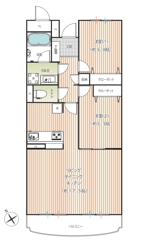- LDK(約17.5帖)・洋室1(約5.0帖)・洋室1(約5.5帖)