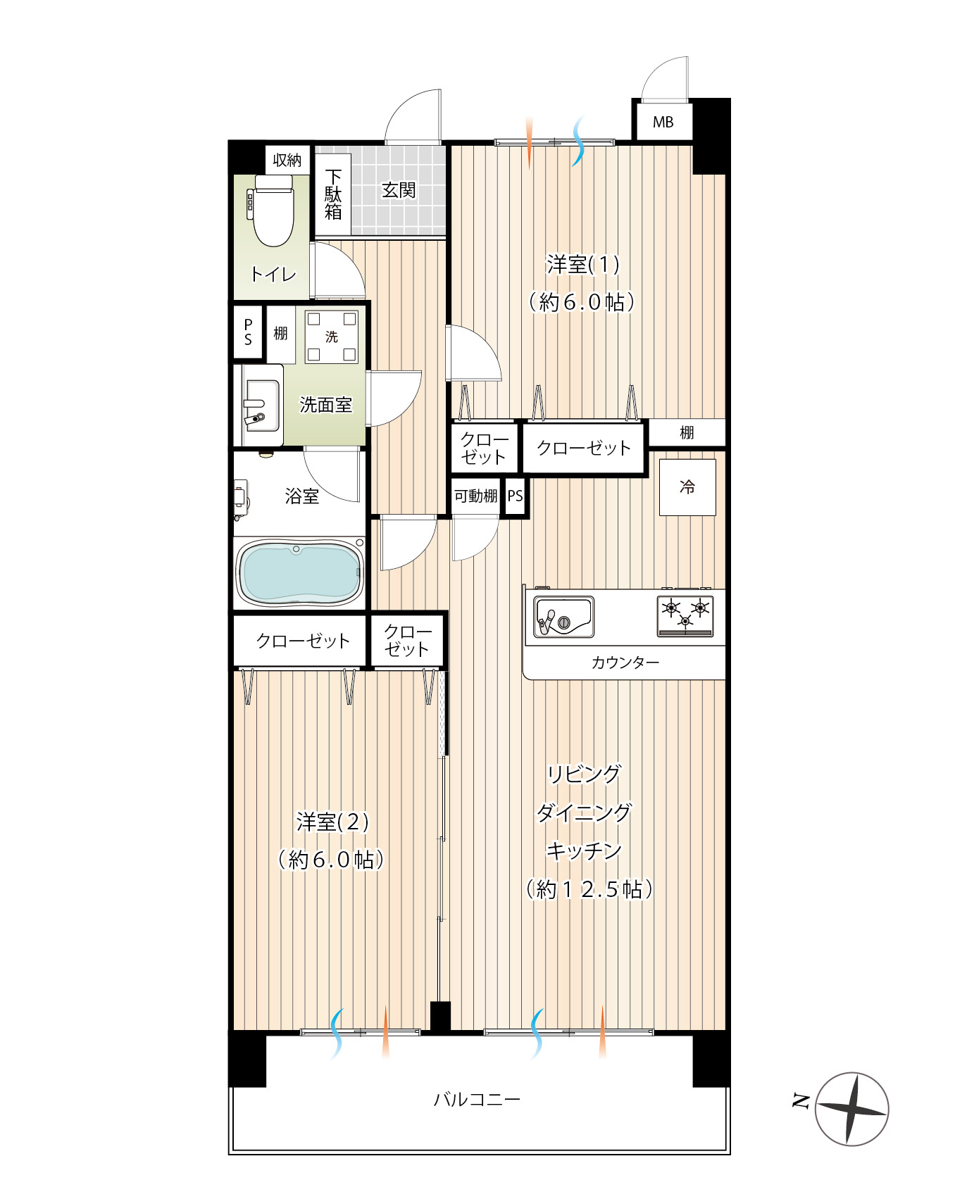 - LDK(約12.5帖)・洋室1(約6帖)・洋室2(約6帖)