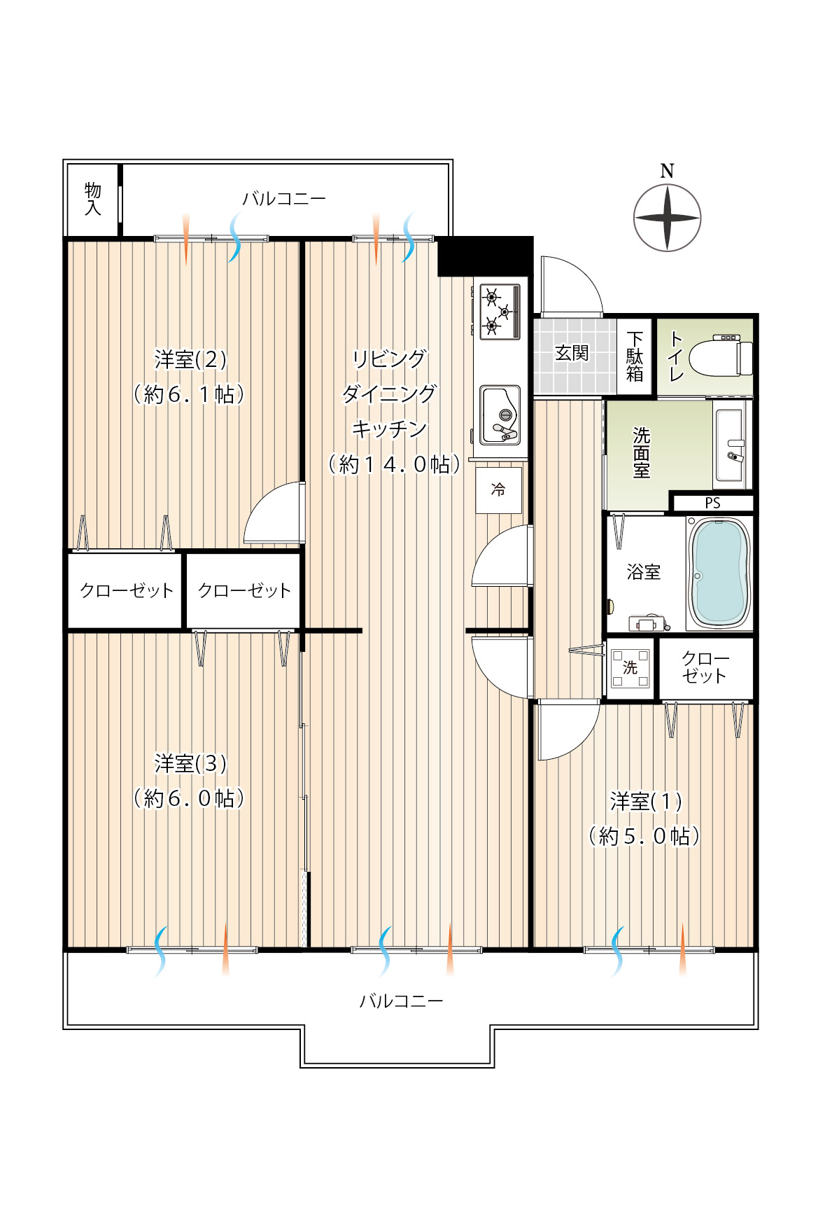 - LDK(約14帖)洋室1(約5.0帖)洋室2(約6.1帖)洋室③(約6.0帖)