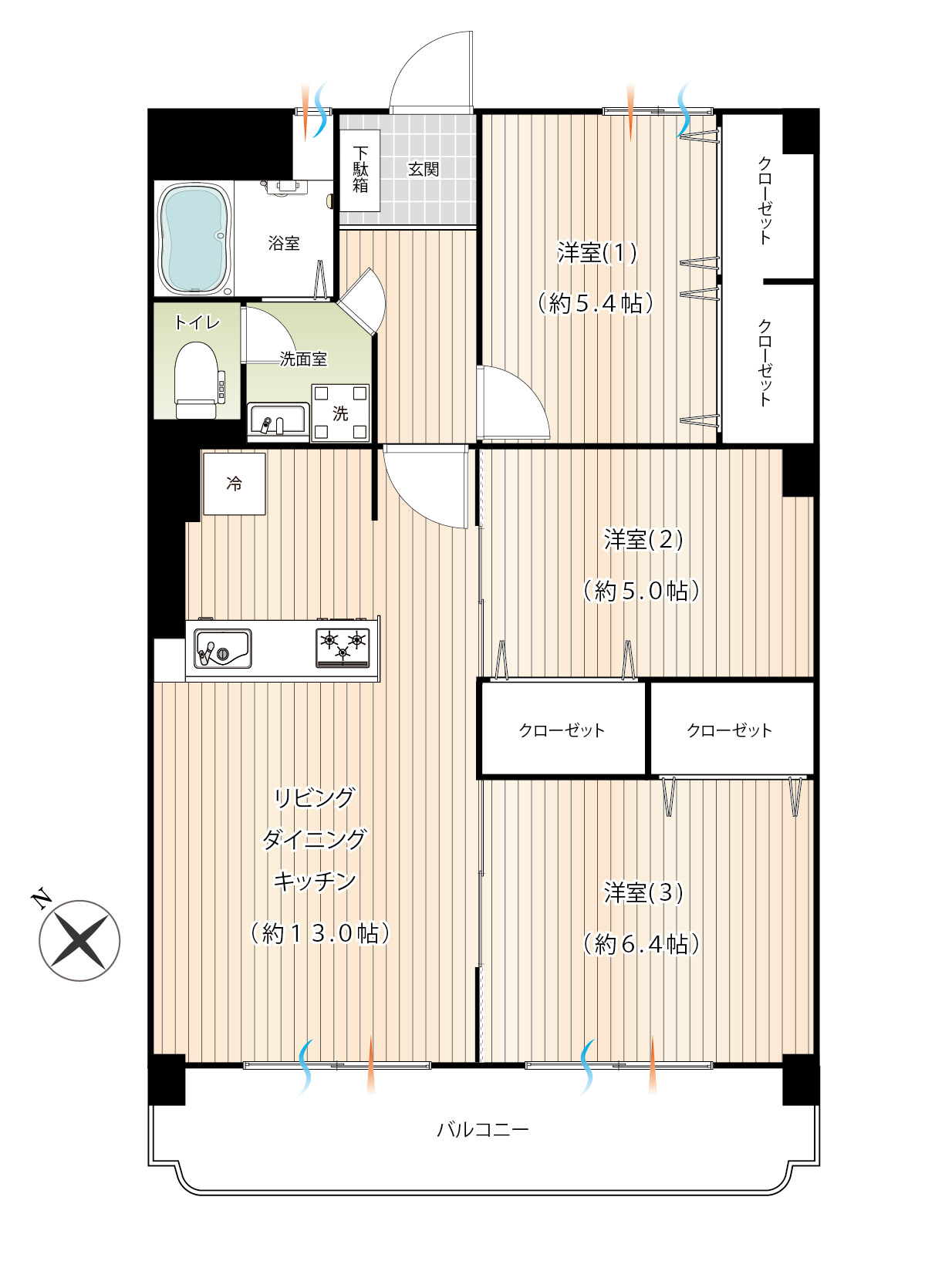 - LDK約13帖、洋室1約5.4帖、洋室2約5.0帖、洋室3約6.4帖