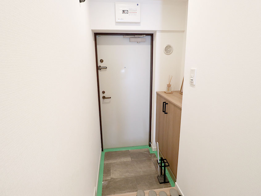 シューズボックスとコートフック、人感センサー照明付きの玄関
