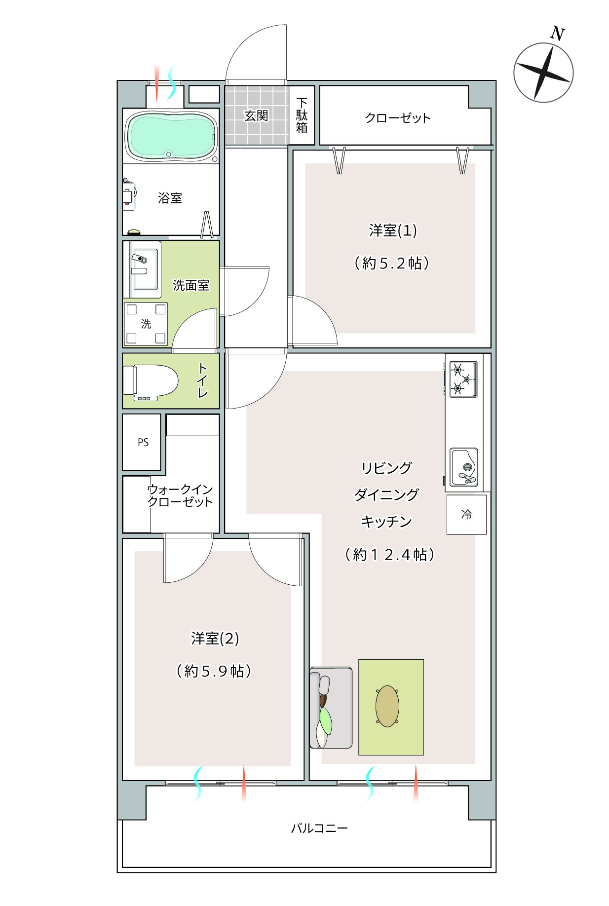 - LDK(約12.4帖)、洋室1(約5.2帖)、洋室2(約5.9帖)