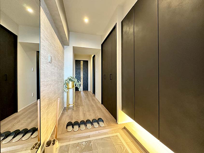 足元を照らす照明付き大容量シューズボックスを完備