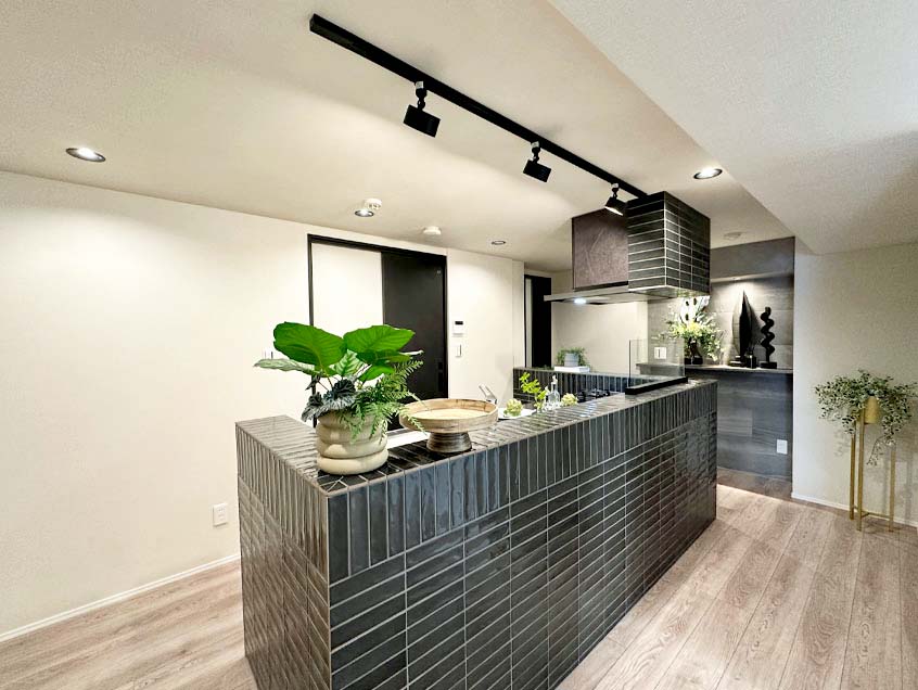 タイルを施したおしゃれなキッチンの腰壁
