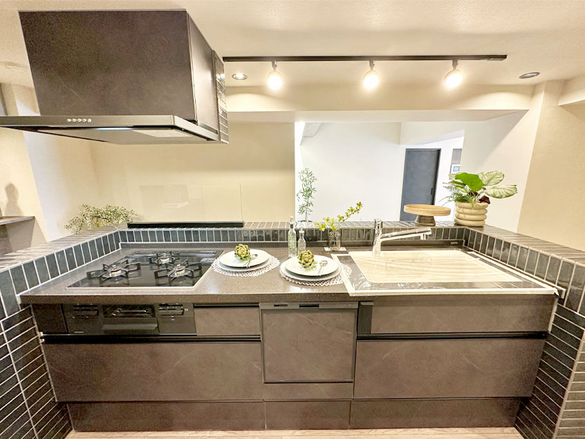 三つ口コンロ、食洗機、浄水器付き水栓を完備したキッチン