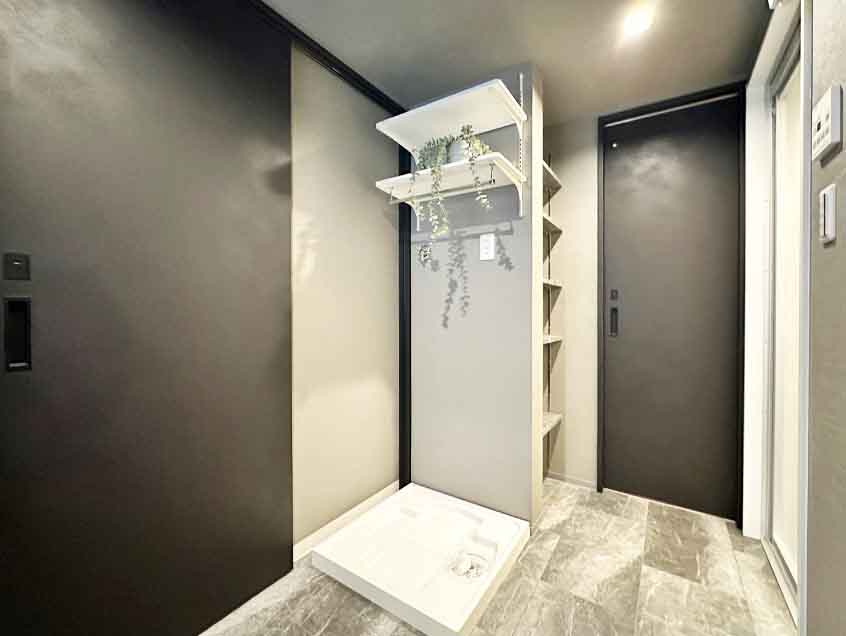 洗濯機置き場の上には便利な棚を造作