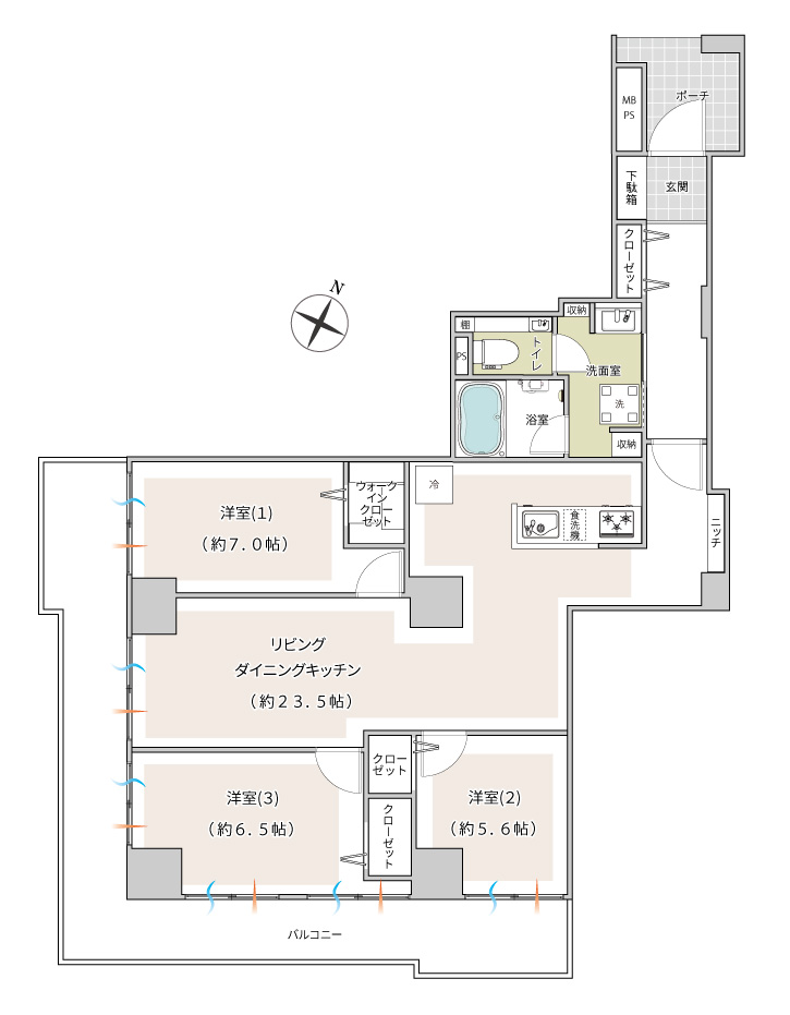 - LDK(約23.5帖)、洋室1(約7.0帖)、洋室2(約5.6帖)、洋室3(約6.5帖)