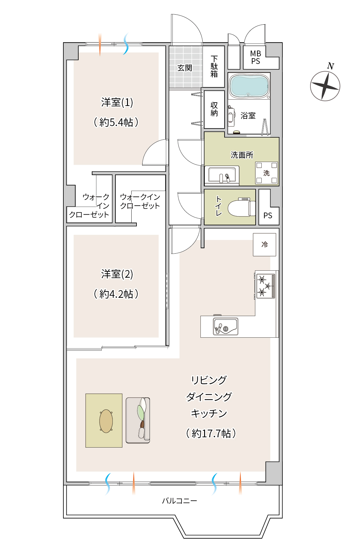 - LDK約17.7帖、洋室1約5.4帖、洋室2約4.2帖