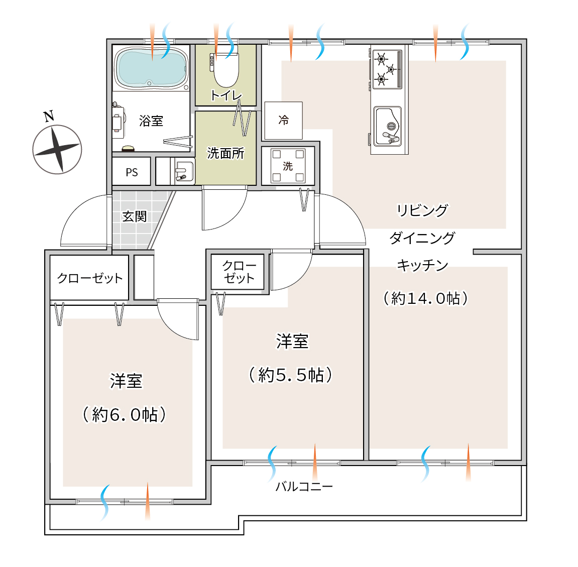 - LDK約14.0帖、洋室1約6.0帖、洋室2約5.5帖