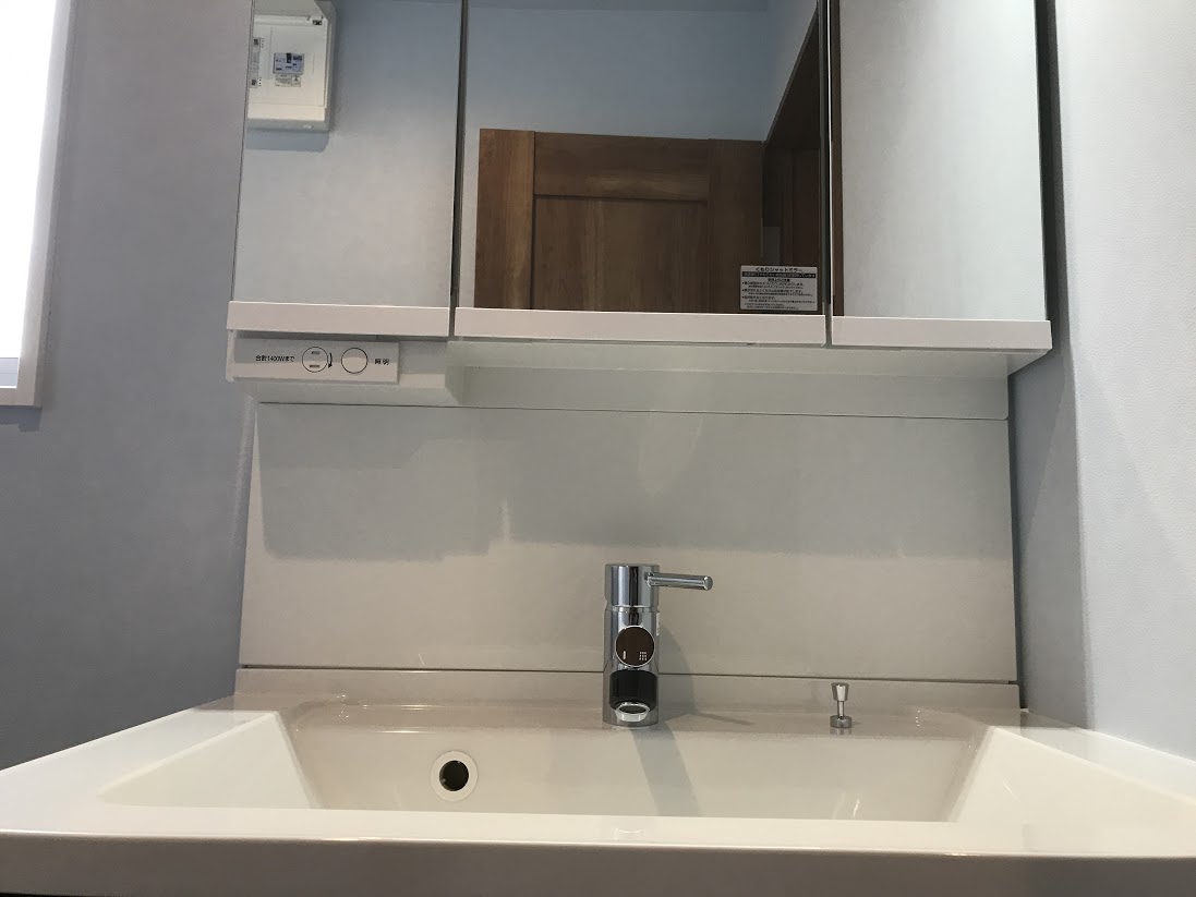 清潔感あるホワイトの洗面台はワイドな三面鏡