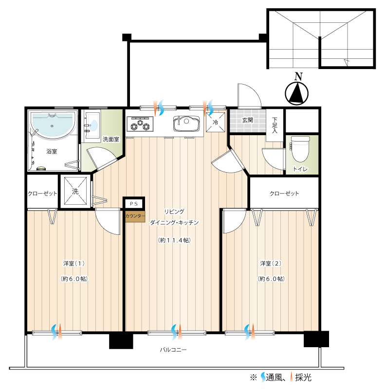 - リビングダイニング・キッチン(約11.0帖)、洋室(約6.0帖)、洋室(約6.0帖)