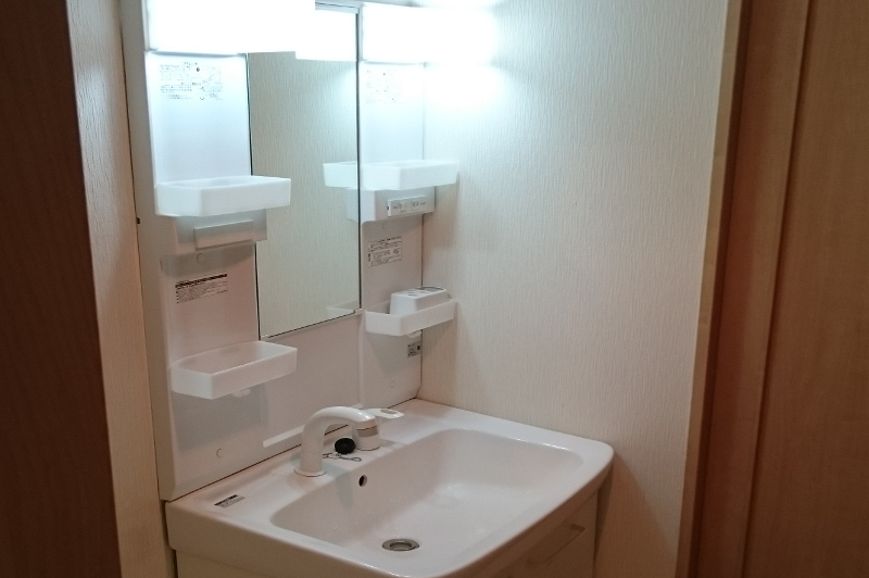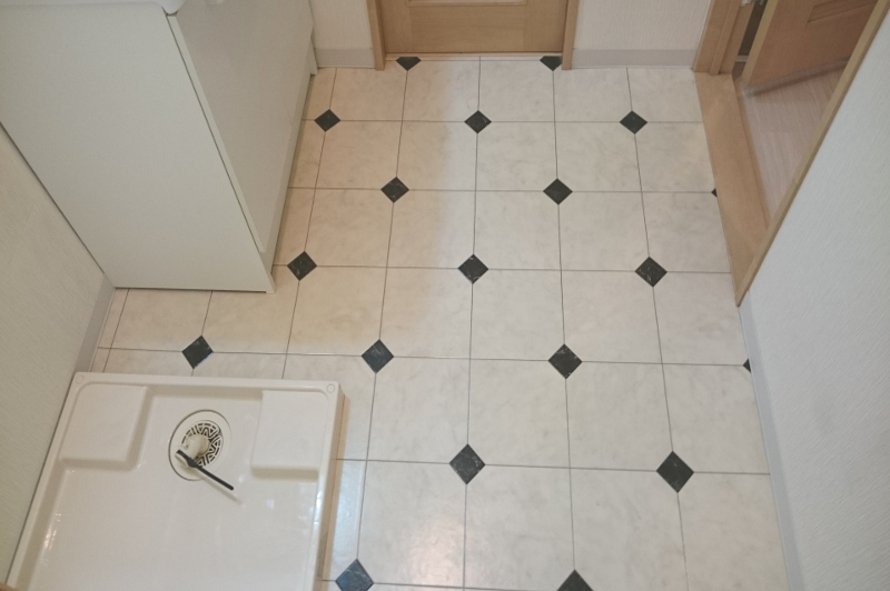 清潔感あるフロアタイルの洗面室。洗濯機置場を完備