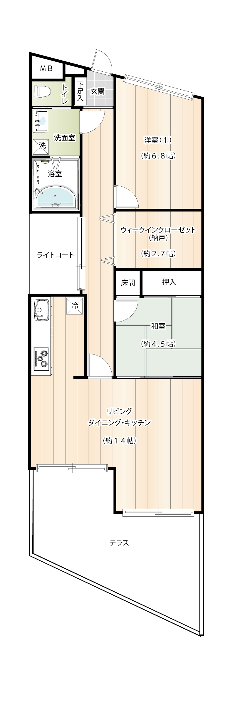 - リビングダイニング・キッチン(約14.0帖)、洋室(約6.8帖)、和室(約4.5帖)、納戸(約2.7帖)