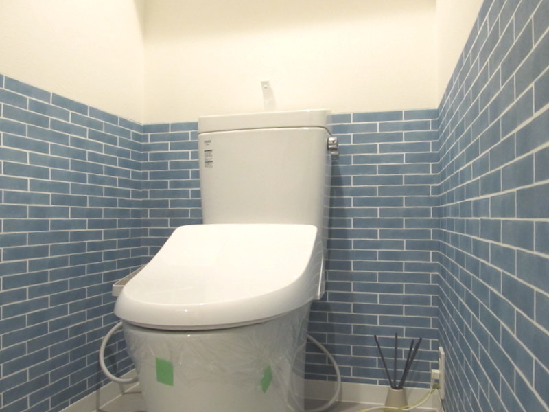 温水洗浄便座に新規交換。水回りは腰壁クロスで仕上げています