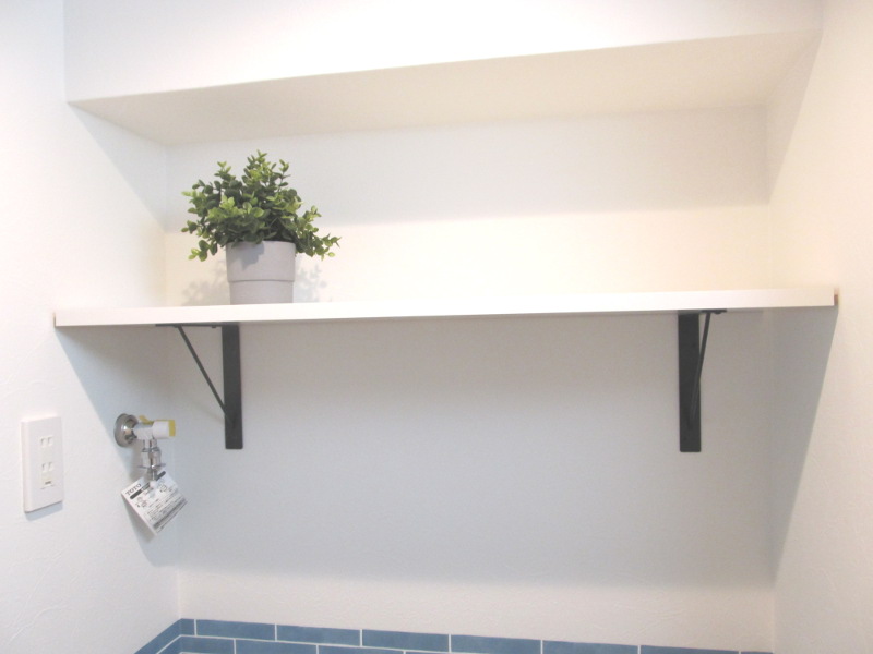 洗濯機置場の上には洗剤を置いたりインテリアを楽しめる収納棚