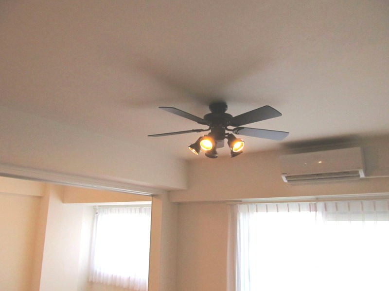空気を循環させるシーリングファンライトを付けたリビング