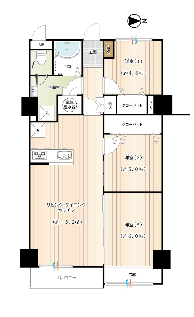 - リビングダイニング・キッチン(約15.2帖)、洋室(約7.5帖)、洋室(約6.0帖)