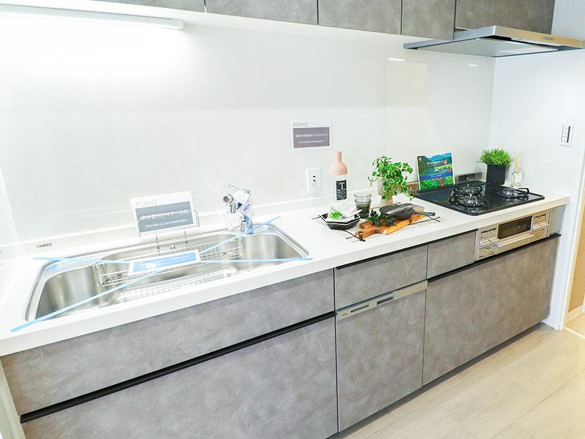 浄水器付き水栓や三つ口コンロを完備したシステムキッチン