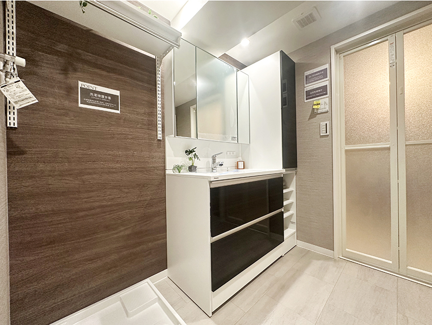 収納スペースが多くゆとりのある洗面所です