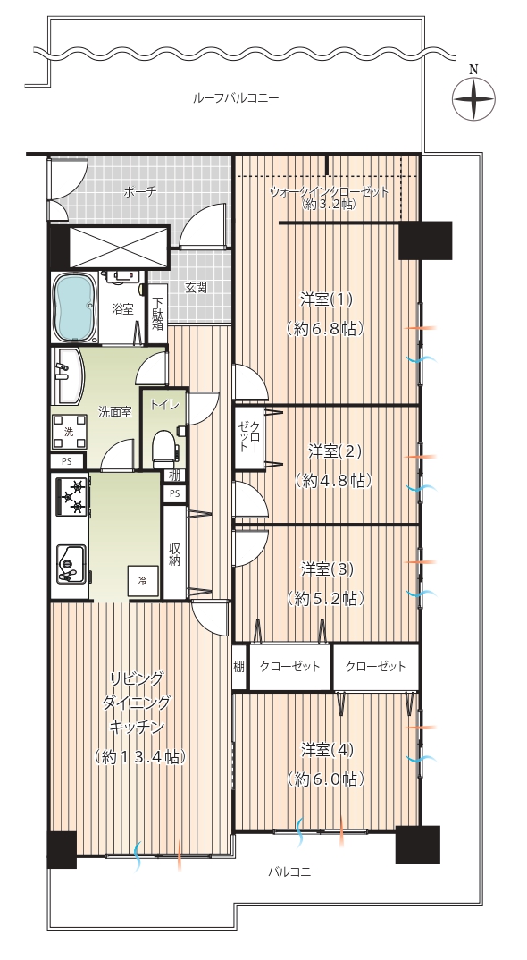 - LDK(約13.4帖)洋室1(約6.8帖)洋室2(約4.8帖)洋室3(約5.2帖)洋室2(約6.0帖)