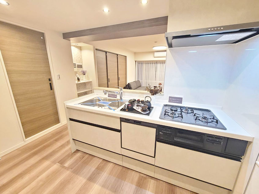 食洗機や三つ口コンロ、浄水器付き水栓を完備したキッチンです